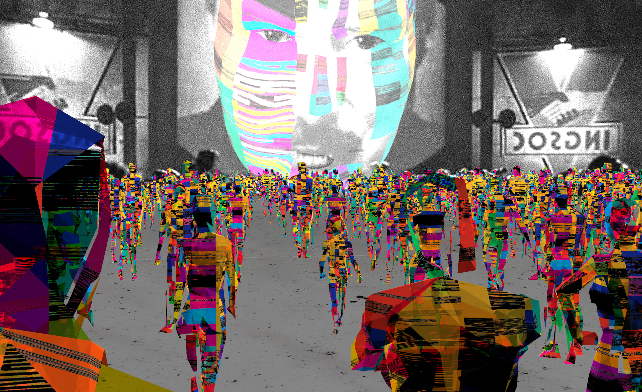 The Two Minutes Hate︎︎︎ is the daily, public period during which members of the Outer Party of Oceania must watch a film depicting the enemies of the state, which allows the citizens of Oceania to vent their existential anguish and personal hatreds towards politically expedient enemies. I used the visuals I made to create the images of the Two Minutes Hate and the atmosphere of the city and its citizens.